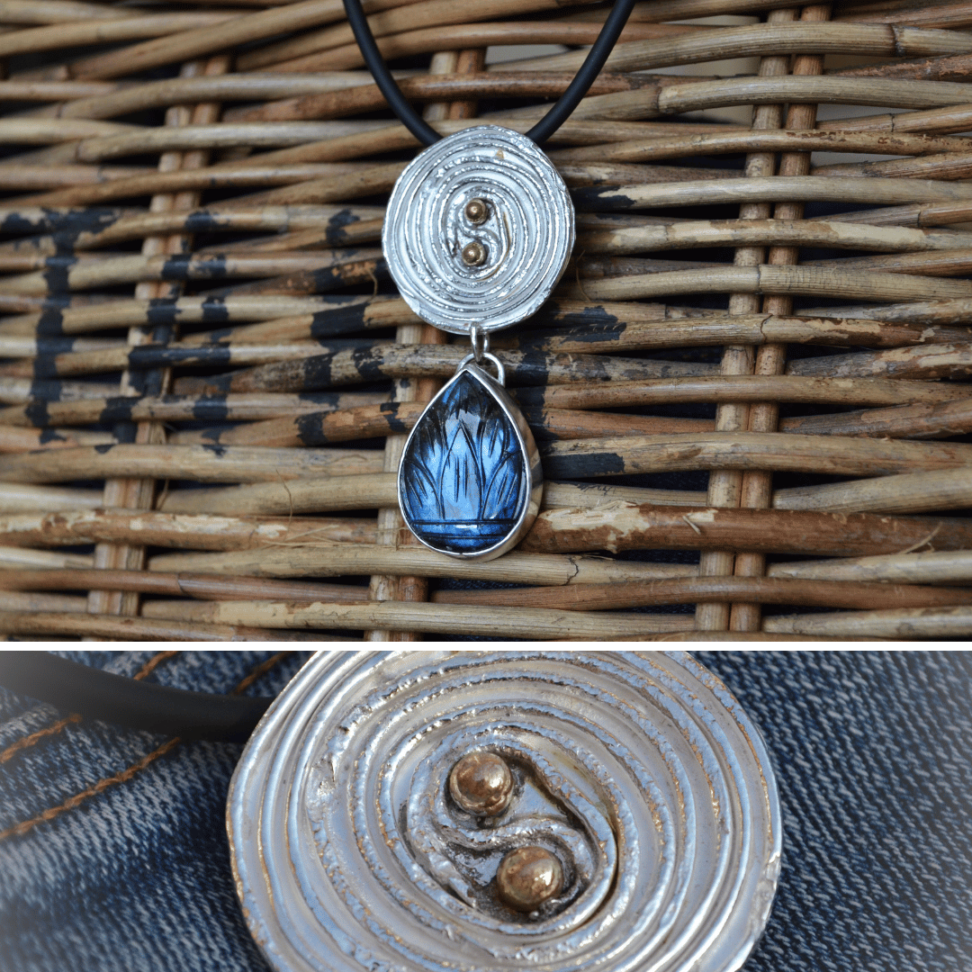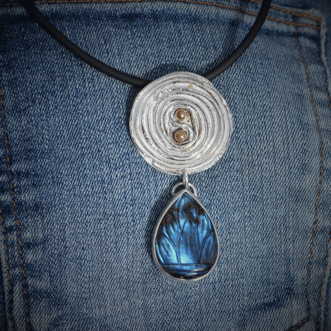 Bijzonder halssieraad van een spiraal van zilver (en messing bolletjes) en een mooie geslepen Labradoriet.